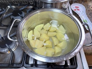 Paso 1: Lavamos las papas bien y luego las pelamos y cortamos en trozos medianos. Las colocamos en una olla con agua fría con sal y cocinamos hasta que al introducir el tenedor estén suaves.