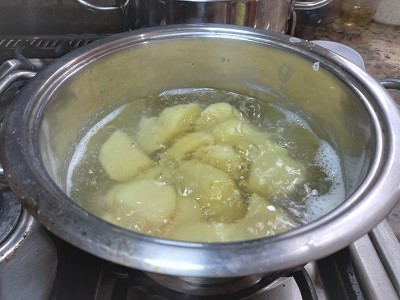 El proceso de cocción es tan importante como saber escoger las papas adecuadas. Para un puré de papas perfecto. Lavamos, secamos y pelamos las papas. Luego las troceamos en pedazos medianos y los colocamos en una olla con agua fría con sal y cocinar hasta que estén suaves, pero sin que se deshagan. No debemos picar los trozos demasiado pequeños para que se cocinen más rápido, haciendo eso corremos el riesgo de que se deshagan durante la cocción.