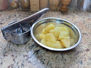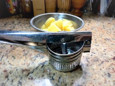Para triturar las papas cocidas podemos usar desde un simple tenedor hasta el conocido pasapurés. Con el tenedor obtenemos una textura un poco más rústica, con pequeños tropezones de papas. Hay quienes usan una batidora eléctrica de mano para triturar las papas y obtener un puré muy suave. Sin embargo, con esta técnica se corre el riesgo de batir demasiado y obtener una textura gomosa que no deseamos en nuestro puré. También pueden usar un aplastador de vegetales para aplastar las papas. La mejor opción es usar un clásico pasapurés como el que se ve en la imagen; tritura muy bien las papas y nos da una consistencia suave que se convertirá en un puré cremoso al agregarle la leche y la mantequilla.