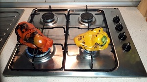 Paso 1: Pon asar los pimentones directamente en la hornilla. Dales vuelta para que la piel se ase uniformemente. La idea de esto es quemar la piel del pimentón para poder quitarla con facilidad y darle un sabor ahumado. También puedes asarlos en el horno a una temperatura alta. Si los asas en el horno también debes rotarlos para asegurarte de que la piel se este quemando de forma homogénea.