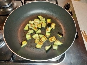 Paso 2: Colocamos la berenjena picadas en un bol agregamos poco de aceite de oliva y pimienta y mezclamos bien. Luego salteamos en una sartén a fuego alto hasta que vean que se empiezan a dorar y reservamos.