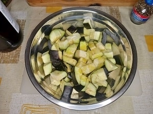 Paso 1: Cortamos la berenjena en cubos de un centímetro aproximadamente. La colocamos en un colador grande, rociamos con abundante sal y déjala sudar por mínimo una hora, para que se sude. Notarán que suelta un líquido marrón. Luego las lavamos con mucha agua y secamos bien. Hay quienes consideran innecesario poner a sudar las berenjenas, en un post anterior sobre cómo escoger las berenjenas les explico porque es importante hacerlo