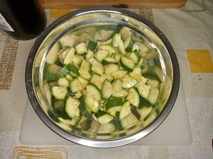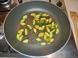 Paso 3: Picamos el calabacín en cubos de un centímetro, colocamos en un bol, agregamos un poco de aceite de oliva y salpimentamos a gusto. Mezclamos bien y salteamos en una sartén a fuego alto hasta que vean que se empiezan a dorar y reservamos.