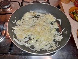 Paso 4: En la misma sartén que salteamos la berenjena y el calabacín agregamos un poco más de aceite de oliva y sofreímos a fuego medio bajo la cebolla picada en julianas. Agregamos una pizca de sal para ayudarla a que suelte sus jugos y se cocine mejor.