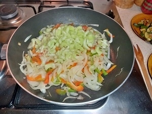 Paso 5: Cuando la cebolla cristalice, es decir, se vuelva transparente agregamos el pimentón o pimiento cortado en julianas. Los dejamos cocinar un par de minutos e incorporamos el celery picado en rebanadas y dejamos cocinar un minuto o dos.