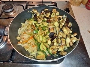 Paso 7: Incorporamos la berenjena y el calabacín que cocinamos previamente. Mezclamos todos los ingredientes y agregamos el vinagre de manzana y dejamos cocinar hasta que el vinagre se evapore.