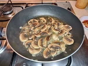 Paso 1: En una sartén a fuego medio-alto agregamos un poco de aceite de oliva. Incorporamos la cebolla picada finamente y dejamos sofreír hasta que se vuelva transparente. Luego agregamos el ajo y los champiñones rebanados. Mezclamos y dejamos cocinar por un minuto