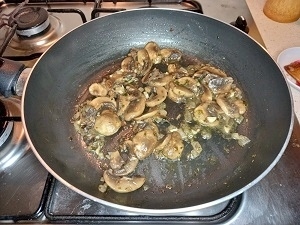 Paso 2: Agregamos el vino blanco y dejamos cocinar hasta que se evapore el alcohol y el líquido segregado por champiñones se seque un poco.