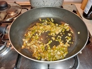 Paso 3: En esa sartén agregamos la cebolla mediana picada finamente, agregamos una pizca de sal para ayudarla a sacar sus jugos. Mezclamos bien tratando de rascar lo que quedó pegado del cerdo cuando lo sellamos, esto tiene muchísimo sabor. Cuando se vuelva transparente incorporamos el pimentón picado finamente, cuando este se empiece a ablandar se le agrega el ajo picado finamente para que no se nos queme.