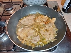 Paso 4: Volvemos a incorporar los filetes de cerdo y agregamos el líquido del marinado y dejamos que se cocine hasta que se evapore el alcohol, unos 10 minutos aproximadamente.