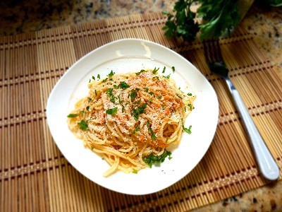 Servimos y decoramos con parmesano rallado y perfil fresco picado. Nuestros Espaguetis a la carretiera están listos.