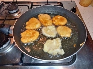 Paso 4: En un sartén coloca abundante aceite y deja calentar hasta obtener la temperatura adecuada. Para saberlo introduce la punta de un palillo de madera y si se forman burbujas la temperatura es ideal para freír los buñuelos. Utilizando dos cucharillas toma pequeñas porciones de la masa y déjalas caer suavemente en el aceite caliente. Cuando estén dorados de un lado los volteamos, con cuidado de no quemarnos. De esta manera quedarán dorados y esponjosos de ambos lados.