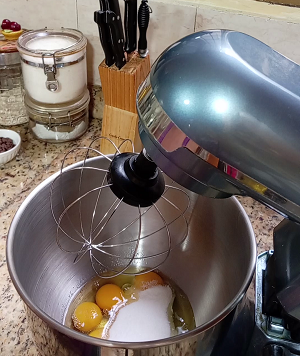 Paso 1: Lo primero que haremos es colocar los huevos en el bol de la batidora junto con el azúcar. Batimos a velocidad media alta hasta que la mezcla se vuelva cremosa y duplique su tamaño. Es importante que los huevos estén a temperatura ambiente para que se puedan batir bien. Les recomiendo romper los huevos en un recipiente aparte antes de agregarlos. Esta es una precaución que siempre debemos tomar por si nos sale algún huevo malo. También pueden usar una batidora de mano para esta receta. Si no cuentan con una, usen un batidor de alambre y nuestra mejor herramienta, nuestras manos.
