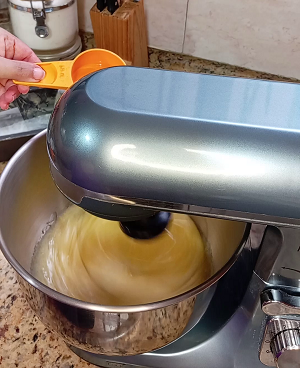 Paso 2: Cuando la mezcla de huevos y azúcar esté cremosa y aumente su volumen, agregamos el aceite y seguimos batiendo hasta integrar perfectamente.