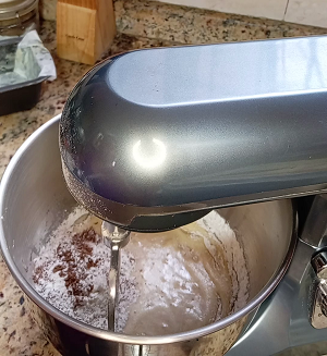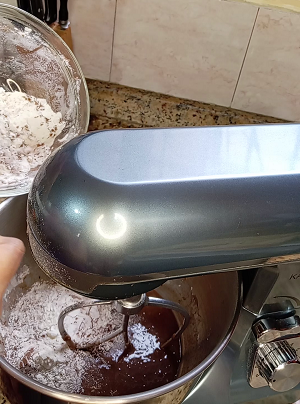 Paso 5: Incorporamos lo que resta de los ingredientes secos y continuamos batiendo hasta integrar perfectamente a la mezcla. Recordando raspar el borde del bol, si vemos que se acumulan los ingredientes secos, es importante que se integren bien a la mezcla.