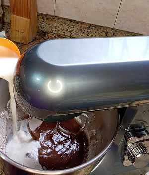 Paso 4: Luego agregamos la leche y seguimos batiendo hasta integrar.