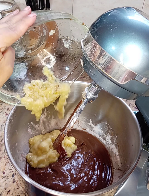 Paso 6: Ahora agregamos las bananas que previamente trituramos un poco hasta convertirlas en un puré rústico. Y mezclamos a baja velocidad hasta que se integre a la mezcla.