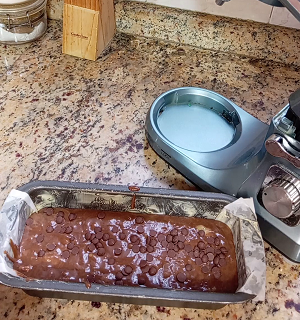 Paso 7: Colocamos la mezcla en un molde para ponqué enmantequillado y enharinado o cubierto con papel manteca o papel encerado. Luego agregamos gotas de chocolate oscuro encima para decorar.