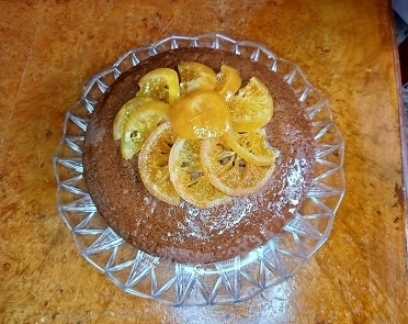 Paso 6: Cuando terminemos de agregar toda la harina y que esté bien integrada pasamos la mezcla a un molde redondo de aproximadamente 25 cm de diámetro enmantequillado y enharinado o cubierto con papel encerado. Horneamos en un horno precalentado a 180 grados centígrados por 35 minutos o hasta que al introducir un palillo este salga seco. Cuando se haya enfriado desmoldamos y decoramos a gusto, en este caso use naranja confitada como decoración.