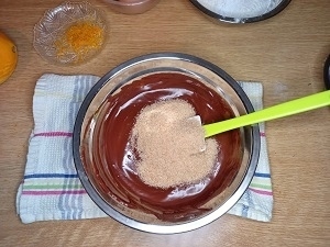 Paso 2: Dejamos enfriar el chocolate unos 10 minutos y agregamos el azúcar. Mezclamos muy bien hasta integrar perfectamente. podemos usar una espátula de plástico, una cuchara de madera, un batidor de alambre o una batidora de mano eléctrica. Lo que tengamos a mano o nos sea más cómodo.