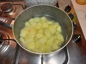 Paso 1: Pon a hervir las papas en abundante agua salada hasta que estén suaves. Para acelerar este proceso, pela y pica las papas en pedazos de unos dos centímetros. No piquen demasiado pequeñas las papas porque se deshará en la cocción y no es lo que queremos.