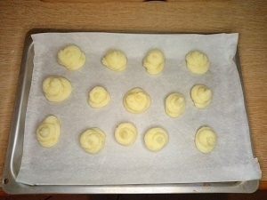 Paso 3: Dejamos enfriar el puré y luego lo introducimos en una manga pastelera con una boquilla de estrella. En una bandeja para hornear cubierta de papel encerado o papel para hornear, formamos las patatas duquesa presionando la manga pastelera en el mismo punto hasta obtener el tamaño que deseamos. Lo ideal es no más de tres o cuatro centímetros de diámetro. Dependiendo de tamaño en que las hagas nos saldrán de 25 a 30 patatas duquesas
